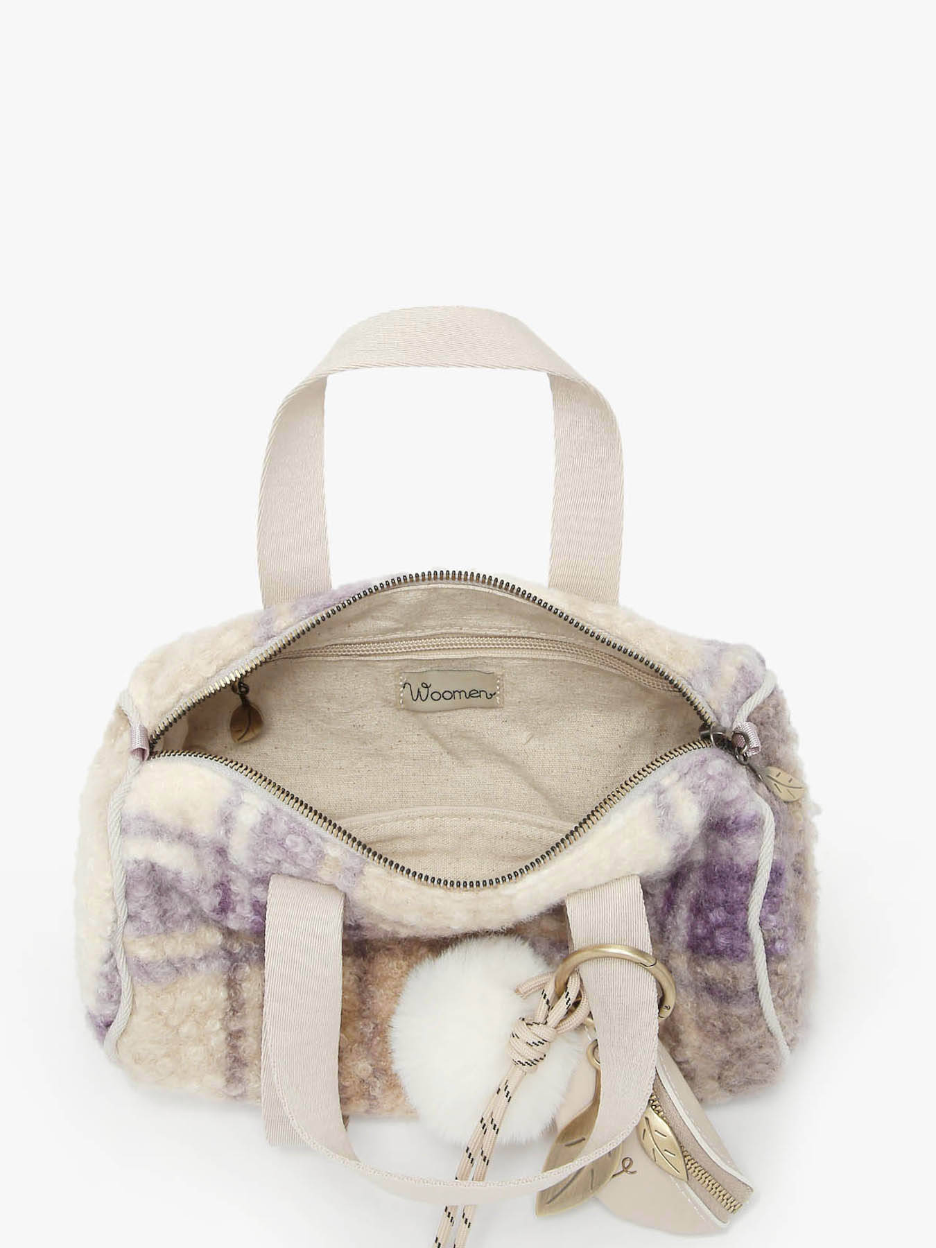 The WOOMEN crossbody bag from the ALYSSUM line, in a mini bowling shape, can be worn crossbody or by hand thanks to its adjustable, removable strap featuring the WOOMEN brand detail. Made from polyester with a cotton and linen lining, it offers a zip closure and an interior with a slip pocket, a zipped pocket, and a single main compartment, enhanced by a bag charm that adds an original and elegant touch.